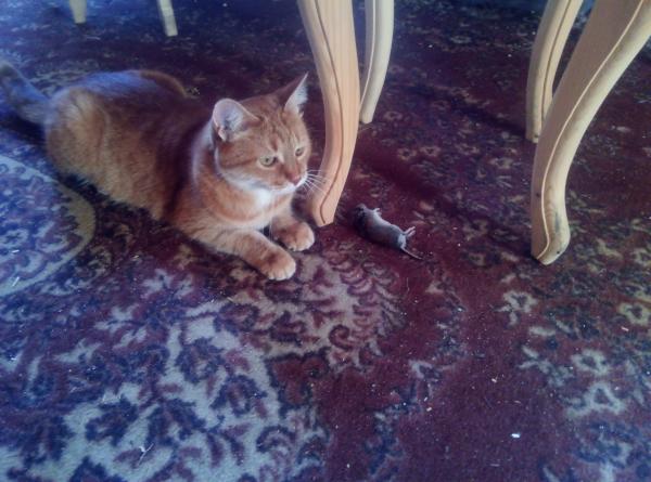 А кошка открыла охотничий сезон. Ну вообще-то синицу она уже притаскивала, но мышь в этом году — первая