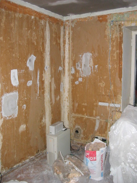Мешочек из под ротбанда, следов выравнивания, однако, видно не особо. На потолке вроде как гипсокартончик... Ничего так, нормально.